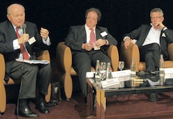 Das Foto zeigt den ehemaligen französischen Kulturminister Jacques Toubon, den Geschäftsführer des Deutschen Kulturrates Olaf Zimmermann, Suhrkamp-Geschäftsführer Thomas Sparr, Börsenvereins-Justiziar … mehr