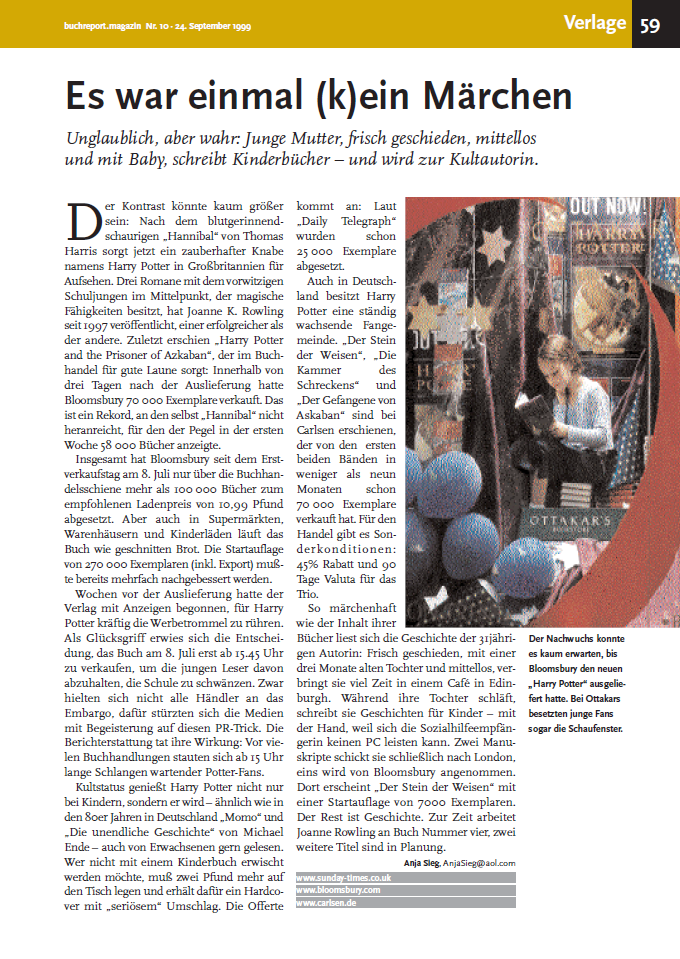Auch in Deutschland besitzt Harry Potter eine ständig wachsende Fangemeinde. „Der Stein der Weisen“, „Die Kammer des Schreckens“ und „Der Gefangene von Askaban“ sind bei Carlsen erschienen, der von den ersten beiden Bänden in weniger als neun Monaten schon 70 000 Exemplare verkauft hat. Für den Handel gibt es Sonderkonditionen: 45% Rabatt und 90 Tage Valuta für das Trio.