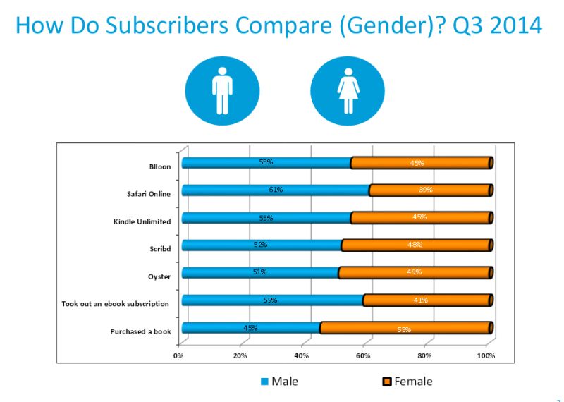Zudem sind Abo-Kunden offenbar durchaus bereit, mehr für eine Ebook-Flatrate zu bezahlen als die durchschnittlichen zehn US-Dollar. Männer würden eine Gebühr von 17 Dollar als fair empfinden, Frauen würden 14 US-Dollar zahlen.