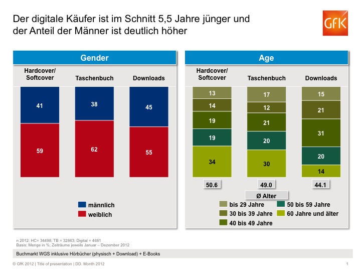 Die Ausgaben im Buchmarkt insgesamt sind im Jahr 2012 mit + 0,4% stabil geblieben. Die Käuferreichweite mit 54% ist weiterhin sehr hoch, auch wenn das Lesen in Konkurrenz zu anderen Entertainment-Produkten wie Gaming, Musik hören, Filme ansehen und anderen Freizeitbeschäftigungen steht. Es gibt immer mehr Buchkäufer in Deutschland: 2012 waren es knapp 37 Millionen. Schaut man sich die Gruppe der E-Book Leser an, so sagen 60%, dass sie den E-Reader zum Lesen bevorzugen. Die Ausstattung mit E-Readern wächst auf 6% der privaten Personen ab 10 Jahren – und hier sprechen wir nicht nur von der jungen Zielgruppe, denn 40% der E-Reader-Besitzer sind 50 Jahre oder älter. Und so ist es nicht verwunderlich, dass die Ausgaben für kostenpflichtige E-Books erstmals die 100 Mio Euro überschritten haben. Verlage müssen sich auf diese veränderten Lebensgewohnheiten einstellen.