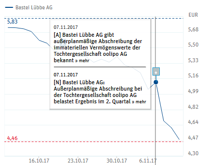 Im Sinkflug: Der Aktienkurs von Bastei Lübbe ist deutlich gefallen, nachdem der Verlag mitgeteilt hat, Oolipo abzuschreiben. Die Grafik zeigt den Kursverlauf mit Stand 13. November 2017, ca. 14 Uhr (Foto: Screenshot Bastei Lübbe, Quelle: EQS Group AG / ARIVA.DE AG).