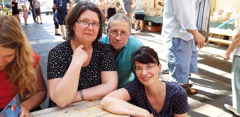 Die Buchhändler Oksana Grimm (Friebe), Rüdiger Rabenow (Lust am Lesen) und Sabine Bake (Wollschläger, v.l.) haben am ersten Juni-Wochenende gemeinsam ein „Bilderbuchfest“ im Berliner Süden organisiert und dafür viele Partner ins Boot geholt. (Foto: privat)