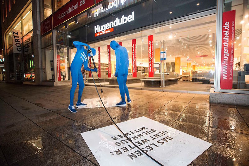 Die Blue Man Group unterwegs auf der Stuttgarter Königstraße? Gefehlt, wenn auch nicht weit: Ein blau maskiertes Team der Buchhandlung Wittwer hat die Schließung der nahe gelegenen Hugendubel-Filiale zum Anlass genommmen, mit einer Guerilla-Marketing-Aktion für das Wittwer-Stammhaus zu werben.