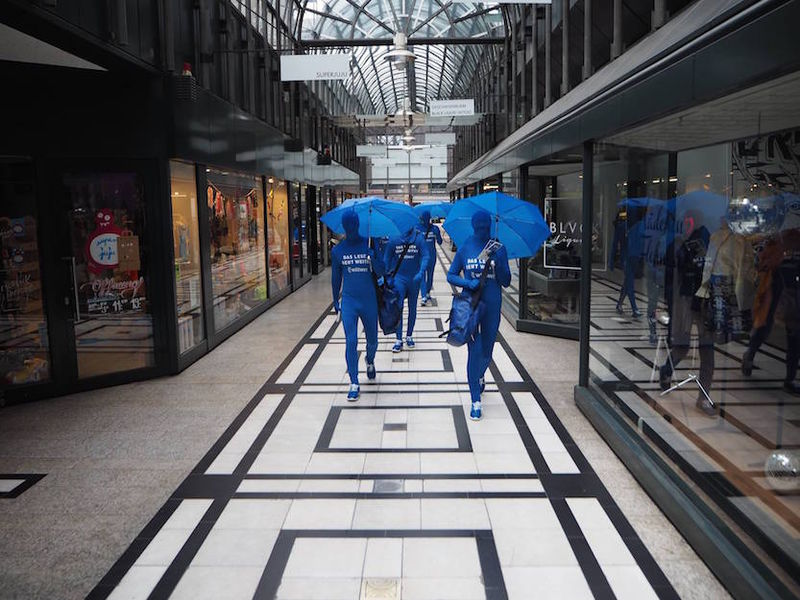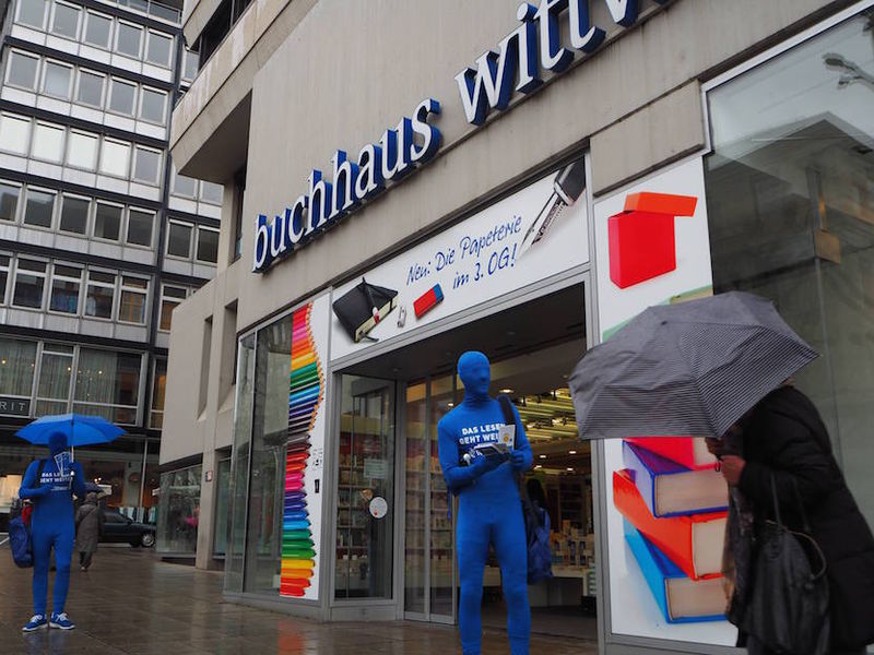 Die Blue Man Group unterwegs auf der Stuttgarter Königstraße? Gefehlt, wenn auch nicht weit: Ein blau maskiertes Team der Buchhandlung Wittwer hat die Schließung der nahe gelegenen Hugendubel-Filiale zum Anlass genommmen, mit einer Guerilla-Marketing-Aktion für das Wittwer-Stammhaus zu werben.