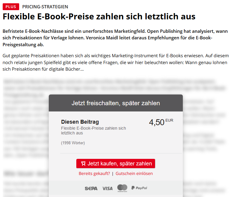 Beim Surfen auf einen interessanten Artikel gestoßen? buchreport bietet auch Nicht-Abonnenten die Möglichkeit, Artikel, Analysen und weitere Angebote einzeln digital zu kaufen. Die angebotenen Artikel stammen aus den gedruckten Ausgaben von buchreport.express, buchreport.magazin und buchreport.spezial und können mit dem Web-Bezahlsystem LaterPay einfach und bequem bezahlt werden.