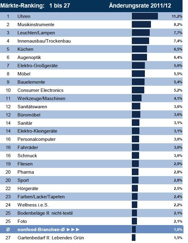 - Der Uhrenmarkt konnte als einzige Branche ein zweistelliges Plus (11,2%) verzeichnen. Das gute Ergebnis wird sowohl auf den Bereich der Luxusuhren als auch die beständige Nachfrage nach der breiten Masse batteriebetriebener Armbanduhren zurückgeführt.