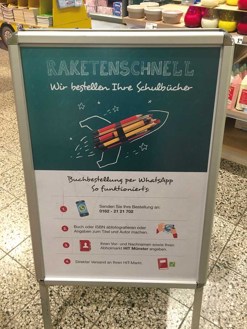 Premiere auf dem Nebenmarkt: Die Mayersche-Tochter B.O.B testet die Buchbestellung per WhatsApp im Lebensmittelhandel. Das mobile Angebot soll eine Versorgungslücke schließen und neue Kundengruppen erreichen. (Foto: Christian Lattmann)