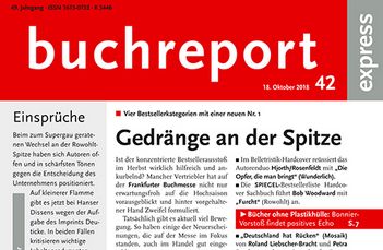 Entschuldigung! Die heute (18.10.) ausgelieferte Druckausgabe des buchreport.express 42 ist „verheftet“: Bogen wurden in der Druckerei in falscher Reihenfolge eingebunden. Das Heft wird noch einmal produziert und (ohne Bestsellerplakate) neu versandt. … mehr