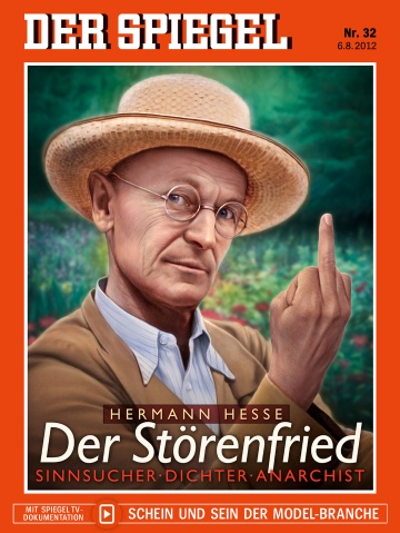 • Der SPIEGEL etwa charakterisiert ihn als „Sinnsucher, Dichter, Anarchist“ und präsentiert Hesse mit gestrecktem Mittelfinger als Titelgeschichte (s. Abb.), in der Matthias Matussek „die Verachtung und die Verklärung, die Unter- ebenso wie die Überschätzung“ analysiert.