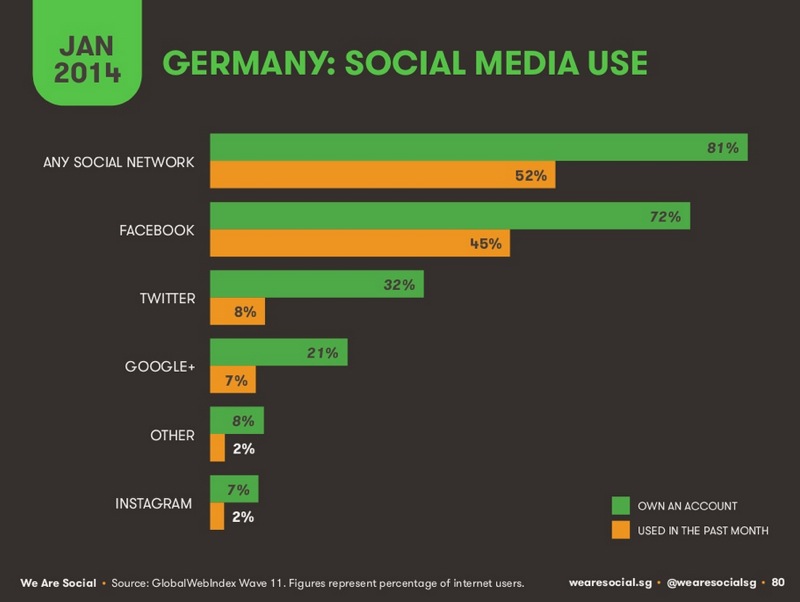 Werden hingegen nur die Internetnutzer betrachtet, so zeigt sich, dass 81% in mindestens einem sozialen Netzwerk angemeldet sind, die meisten bei Facebook (72%) und Twitter (32%). Bei Facebook-Konkurrent Google+ ist hingegen nur jeder Fünfte angemeldet. Viele von ihnen nutzen ihren Account aber nicht mehr aktiv, nur knapp die Hälfte der Internetnutzer hat ihren Account im vergangenen Monat genutzt. Die deutschen Nutzer verbringen am Tag etwa eineinhalb Stunden in sozialen Netzwerken.