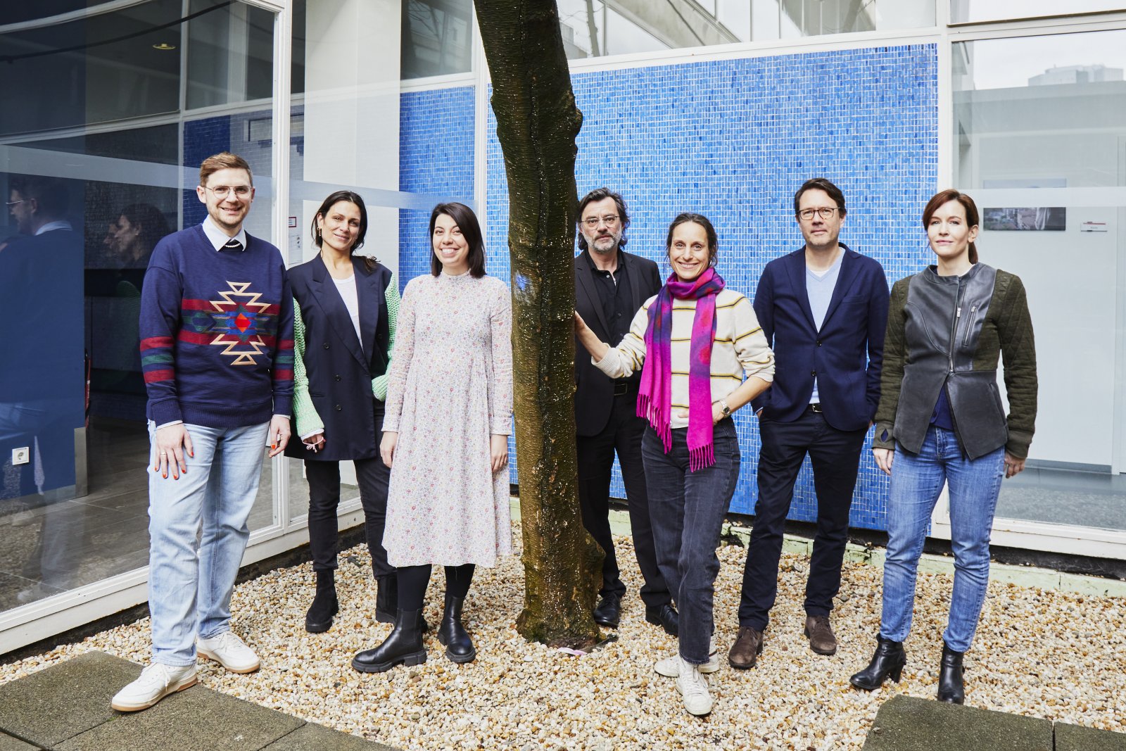 Die Jury des Deutschen Buchpreises 2023 (v.l.): Florian Valerius, Shila Behjat, Lisa Schumacher, Heinz Drügh, Katharina Teutsch, Matthias Weichelt, Melanie Mühl (Foto: Christof Jakob)