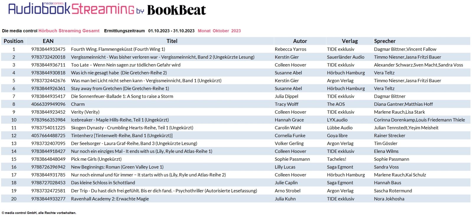 In der von BookBeat veröffentlichten Hörbuch-Streamingliste führt auch im Oktober weiterhin Rebecca Yarros mit dem Titel „Fourth Wing. Flammengeküsst“, erschienen bei Tide exklusiv. Die Hardcover-Version hatte sich in den SPIEGEL-Bestsellerlisten vom Start weg auf Platz 1 im Ranking platziert und hat seitdem die Top 5 nicht verlassen. Aktuell berichtet das US-Filmbranchenmagazin davon, dass sich Amazon die Rechte für die Umsetzung des Buches als Streaming-Serie gesichert habe.