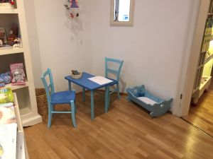 - Kinderzimmer mit Maltisch-Ecke und „Krabbelteppich“ (Pappbilderbücher, Nonbooks für Kleinkinder)