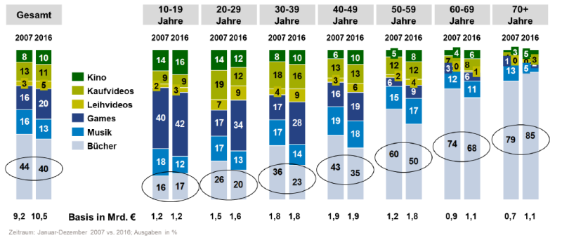 - Ein Grund: Andere Unterhaltungsmedien graben dem Buch das Wasser ab. So hat der Buchmarkt in den vergangenen 10 Jahren in nahezu allen Altersgruppen (mit Ausnahme der 10- bis 19-Jährigen und der Gruppe 70+) Anteile an den Ausgaben für Unterhaltungsmedien verloren, s. Grafik: