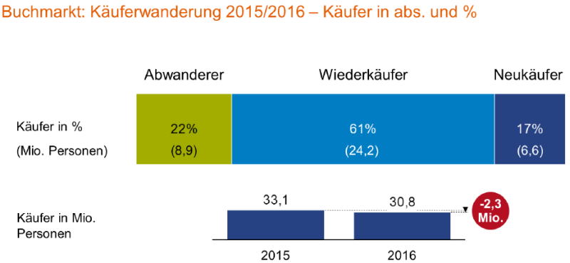 - Eine Analyse der Käuferwanderung für 2015/2016 ergab: Knapp 9 Mio Buchkäufer des Jahres 2015 kauften 2016 kein Buch. Weitere Daten liefert die Grafik: