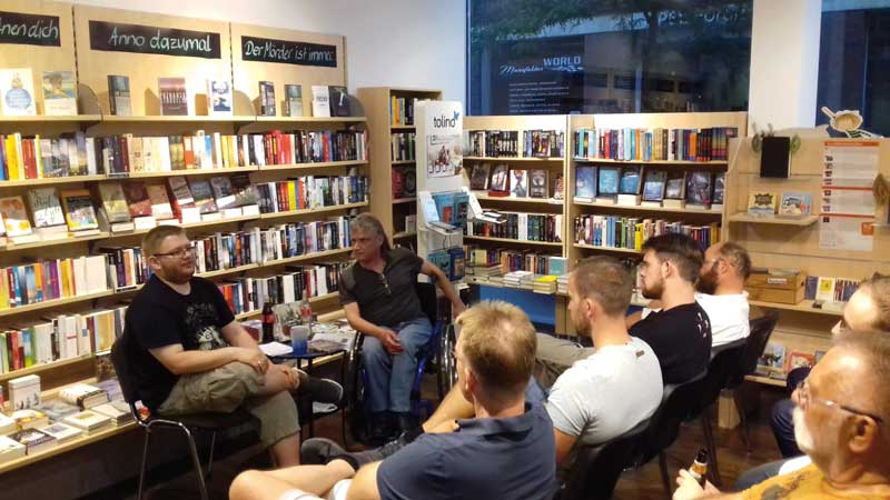 Kapitel 43: Zum zweiten Mal hat Buchhändler Artur Hitschrich in der Rüsselsheimer Buchhandlung Kapitel 43 einen Abend nur für Männer organisiert. Zu Chips und Bier stellten Hitschrich (links) und Kunde Udo Heß eigens ausgewählte Buchtitel vor und diskutierten darüber in der Männerrunde. (Foto: Kapitel 43)