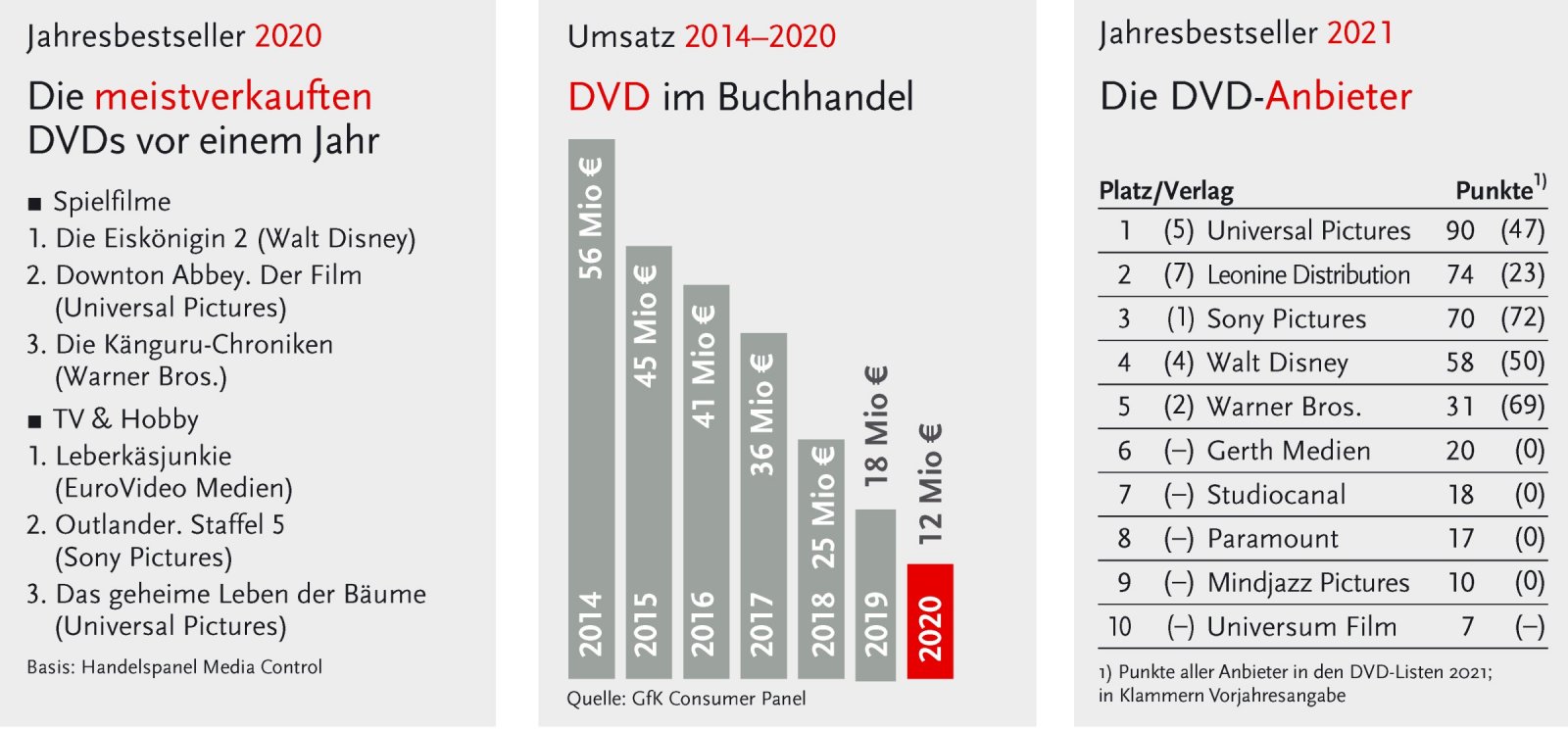 Für den Buchhandel bleibt die DVD trotzdem ein lohnendes Zusatzgeschäft, vor allem als Geschenkartikel sind Filme weiterhin gefragt. Das spiegelt sich auch auf den DVD-Jahresbestsellerlisten wider, wobei die Buchbezüge auffällig sind. Entweder gibt es eine Literaturvorlage oder es folgen den Filmen umgekehrt Romane oder Begleitbücher. Der Spitzenreiter in der Kategorie Spielfilme, „James Bond 007. Keine Zeit zu sterben“, geht auf die Romanreihe von Ian Fleming zurück. „Catweazle“ auf Platz 2 ist eine Kinoadaption der BBC-Serie aus den 70ern, aus der Romane entstanden.