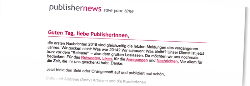 Im Internet gibt es ein großes Reservoir an News und Analysen zu Medien- und Publishing-Themen: Aber die Suche ist aufwendig und angesichts der Fülle an Medien und Themen fällt es schwer, den Überblick zu behalten und Relevantes von weniger Interessantem zu scheiden. Das leistet publishernews und wertet aus den Internetseiten der Medien, Weblogs und Social-Media-Kanälen jene Beiträge aus, die von den Fachleuten besonders intensiv diskutiert werden und einen großen Praxisbezug haben. Zum Jahresbeginn 2015 erhöht der von Andreas Artmann gestartete und von B&W Newsmaker (Mannheim) herausgegebene Dienst die Schlagzahl und kooperiert mit pubiz, dem 2013 gestarteten buchreport-Fachinformationsportal für die Verlagsbranche.