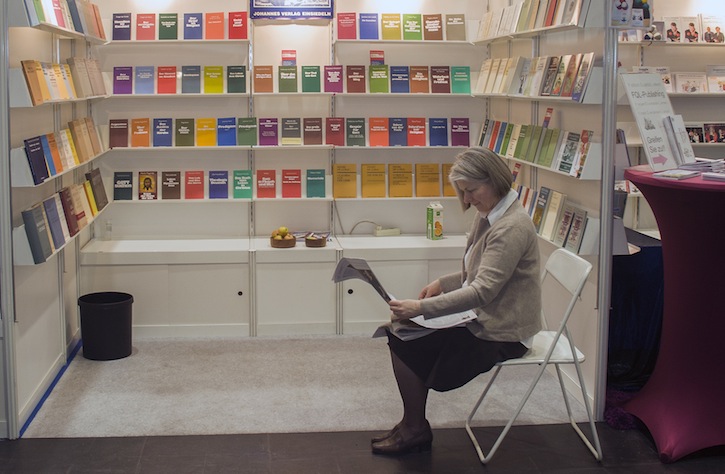 Zwischendurch Zeit für die Tagespresse: Marta Pavlikova am Stand des Johannes Verlags aus Einsiedeln in der Schweiz.