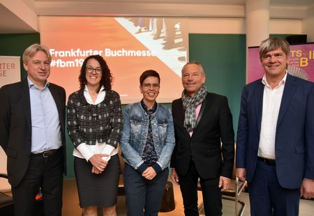 Sprecher der Pressekonferenz (v.l.): Juergen Boos (Direktor der Frankfurter Buchmesse), Angela Dorn (Hessische Ministerin für Wissenschaft und Kunst), Prof. Bernd Kracke (Präsident der Hochschule für Gestaltung (HfG) Offenbach und Künstlerischer Leiter der B3), Wolfgang Bergmann (Geschäftsführer ARTE Deutschland GmbH), Katja Böhne (Geschäftsleitung Marketing und Kommunikation, Frankfurter Buchmesse). Foto: Rainer Rüffer