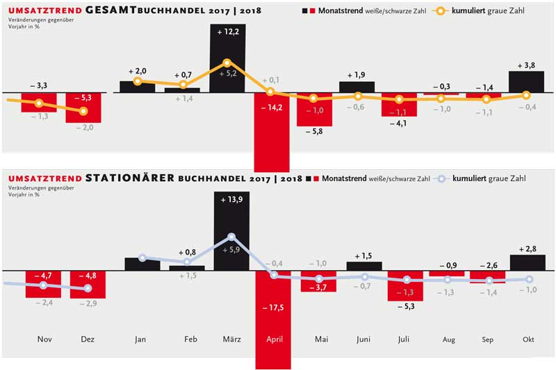Kein goldener Oktober, aber zumindest kalendarische Treiber, die dem Buchumsatz geholfen haben als Ausgleich für den Fehltag, der das Geschäft im September gedrückt hatte. Dabei hat allerdings der stationäre Handel von den zusätzlichen Öffnungszeiten nicht besonders profitiert. wie der Abstand zum Gesamtmarkt einschließlich Online-Shops zeigt. Die Oktober-Zahlen im Überblick: