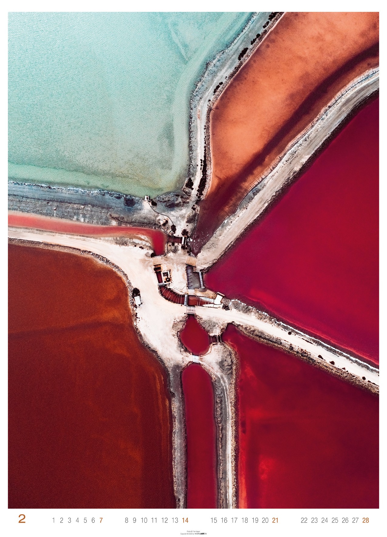 Die Luftaufnahmen von Salzteichen im großformatigen Kalender „Die Farben von Salz 2021“ wirken wie abstrakte Kunstwerke. („Tom Hegen: Die Farben von Salz 2021“ © Athesia Kalenderverlag GmbH)