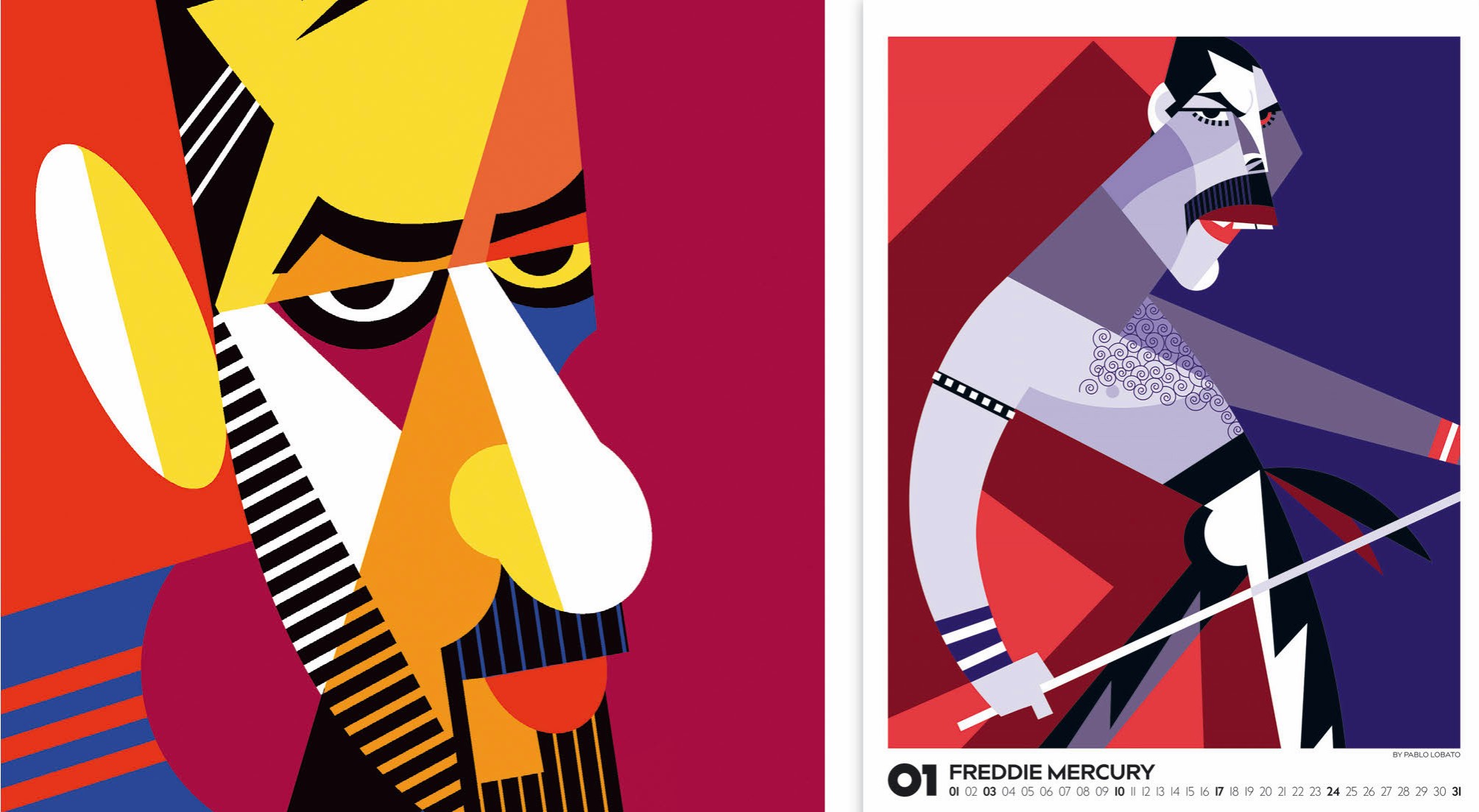 Es war beim ersten Blick klar, dass die plakativen, farbintensiven Arbeiten Pablo Lobatos die ganz große Bühne eines Wandkalenders brauchen – zumindest sind sie für das Medium perfekt geeignet –, und es stand außer Frage, dass wir unser größtes Kalenderformat einsetzen müssen. Lobato schafft es, mit präziser Beobachtungsgabe und Leichtigkeit in der Linienführung eindrückliche Porträts zu erschaffen. Mit wenigen Elementen bringt er die individuelle Mimik, wenn nicht den Charakter der Porträtierten auf den Punkt. Trotz starker Abstraktion und geometrischer Formen bleiben die Personen unverkennbar und überaus lebendig.