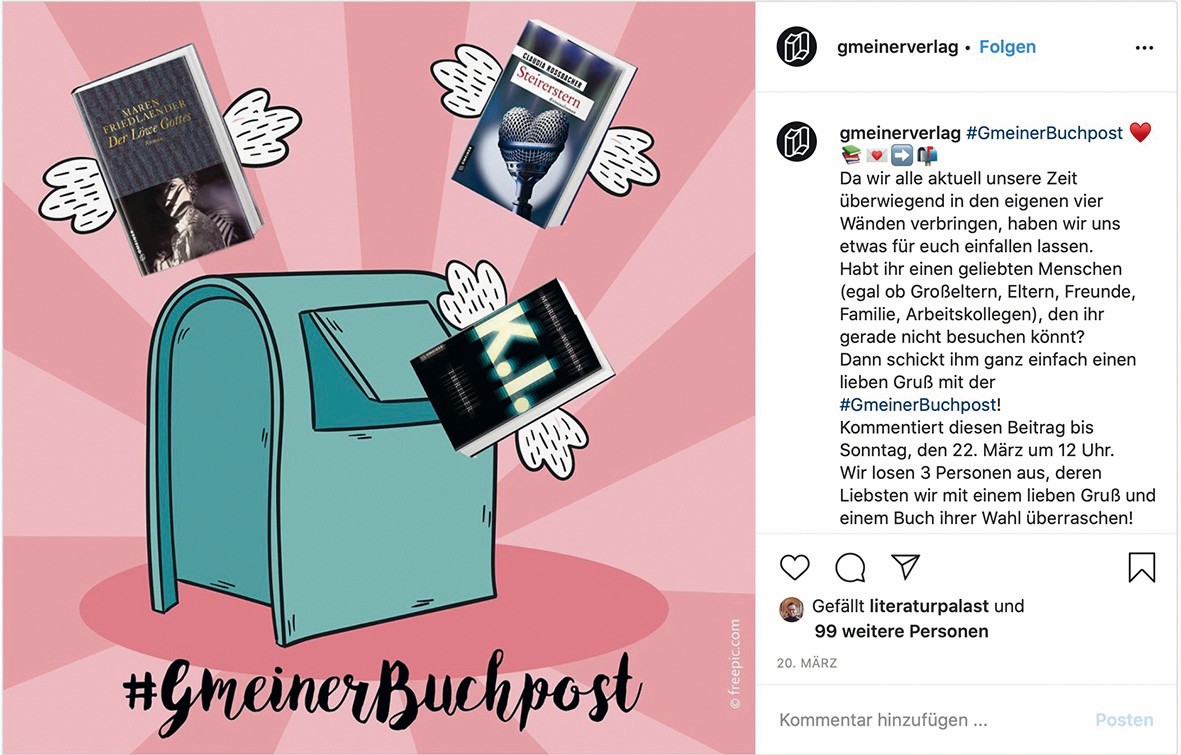 #GmeinerBuchpost: Die Teilnehmer können wöchentlich auf dem Instagram-Kanal des Verlags eines von drei Büchern für einen geliebten Menschen gewinnen, den man gerade nicht besuchen darf. Der Verlag überrascht diese Person dann mit einer Buchpost.
