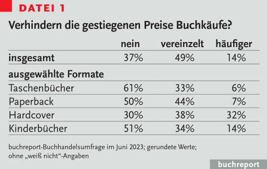 Demnach beobachtet knapp die Hälfte der Befragten, dass die gestiegenen Buchpreise vereinzelt Käufe verhindern. Bei weiteren 14% lassen Kunden sogar häufiger Ware wegen des Preisschilds liegen. Dem stehen 37% gegenüber, die keinerlei Auswirkungen der Teuerung auf den Buchverkauf feststellen können.