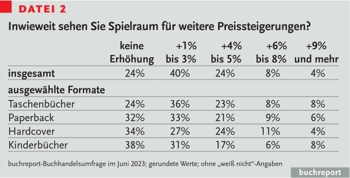 Nach den jüngsten Preisrunden plädiert aber nur ein Viertel dafür, erst mal gar keine weiteren Erhöhungen vorzunehmen. Ansonsten halten sich die Befürworter kleiner Aufschläge (bis 3%) und die Anhänger einer stärkeren Verteuerung (4% und mehr) in etwa die Waage. Der wenigste Spielraum wird bei Kinderbüchern gesehen (s. buchreport.datei 2).