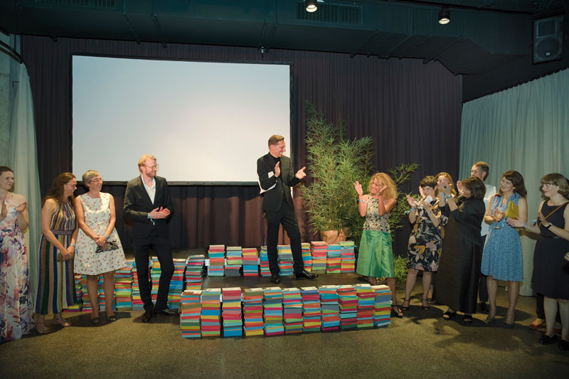 Verleger Peter Haag (Mitte) und Mitarbeiter bei der Verlagsfeier mit Filmpremiere. Der Dreh des humorigen Kurzfilms habe „schelmischen Spaß“ gemacht (Foto: Dominique Melenberg).