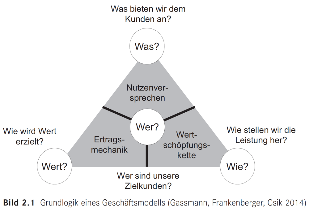 Doch was ist ein Geschäftsmodell? Verkürzt erklärt, ist es die Strategie, die ein Unternehmen fährt, um Wert zu generieren und dabei Geld zu verdienen. Nach Gassmann, Frankenberger und Csik (2014) ist ein Geschäftsmodell die integrale Antwort auf vier Fragen (siehe Bild 2.1):
