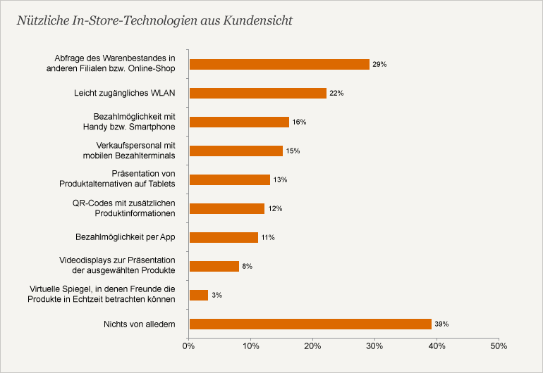 - 29% der Befragten würden es begrüßen, wenn sie mit dem Smartphone oder Tablet im Geschäft den Warenbestand in anderen Filialen oder auch im Internet-Shop abrufen könnten.