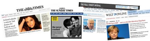 - Seit Anfang Juli sind die Artikel der britischen „Times“ und „Sunday Times“, ebenfalls aus dem Hause News Corp. von Rupert Murdoch, nur noch gegen Bezahlung zu lesen. 105000 zahlende Kunden konnten gewonnen werden. Zum Vergleich: Die gedruckte Auflage liegt bei rund 500000. Massenwirkung geht allerdings verloren: Im zweiten Quartal 2010, als der Zugang noch kostenlos war, hatten 3,1 Mio Besucher die Homepages von thetimes.co.uk bzw. thesundaytimes.co.uk angeklickt. Die Paid-Content-Zahlen seien aber „ermutigend“, sagt „Times“-Chefredakteur James Harding.