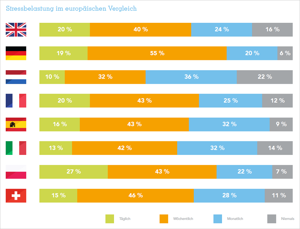 Die am stärksten gestresste Nation ist Polen, wo mehr als ein Viertel (27%) der Arbeitnehmer angibt, täglich Stress ausgesetzt zu sein, gefolgt von Franzosen und Briten mit je 20%. Deutschland steht bei dieser Auswertung mit 19% an vierter Stelle und damit im Mittelfeld der befragten Nationen. Gleichzeitig sagen im Ländervergleich hier aber auch die wenigsten Befragten (6%), niemals im Job gestresst zu sein.