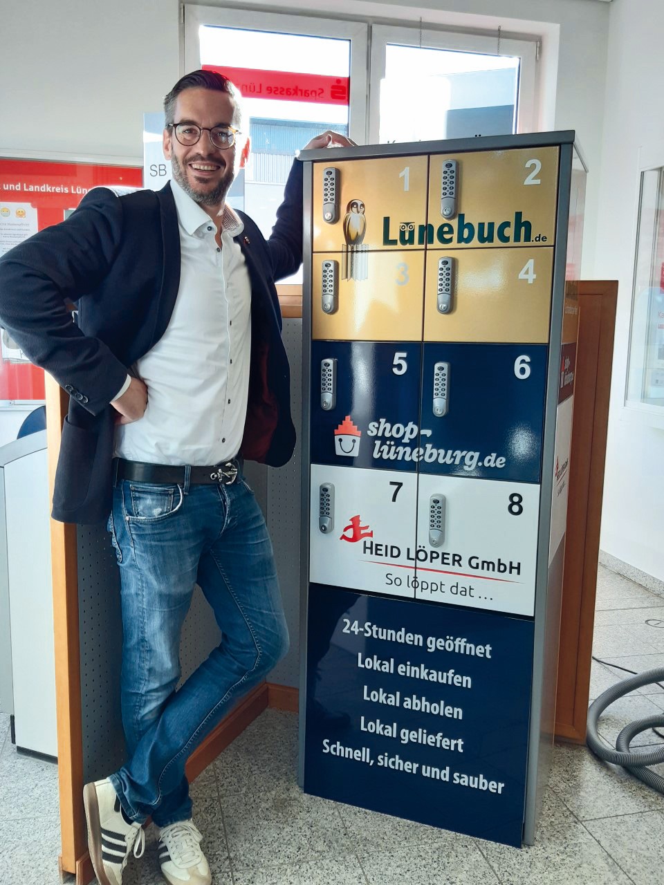 Schnell, sicher, sauber: Lünebuch-Händler Jan Orthey hat Anfang Oktober 2020 Abholboxen neben Geldautomaten der Sparkasse aufgestellt. Getestet werden 3 Standorte, das Geldinstitut hat insgesamt 9 Selbstbedienungsstationen. (Foto: Lünebuch)