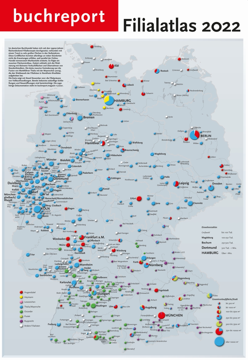 Für den buchreport-Filialatlas 2022 (erschienen im buchreport.magazin 11/2021, hier können Sie die gedruckte Ausgabe inklusive der Filialatlas-Deutschlandkarte im Format 40 x 59 cm bestellen) wurden 878 buchhändlerische Filialstandorte erfasst und analysiert. Enthalten sind darin sowohl der gewachsene Kernbestand des Filialbuchhandels sowie vollzogene oder perspektivische Veränderungen der jüngsten Zeit. Seit der letzten Veröffentlichung vor einem Jahr hat sich immerhin an 20% der Standorte etwas getan: Schließung, Neueröffnung, Flächenveränderung, geänderte Besitzverhältnisse und bisherige Standortbuchhandlungen, die in ein Filialnetz integriert wurden.