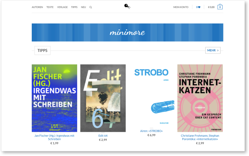 So unterschiedlich das Profil von minimore.de und beispielsweise der Random-House-Shop-Community, das Ziel ist ähnlich: die Sichtbarkeit für das eigene Programm erhöhen. Maleu: „Seit vier Jahren veröffentlichen wir im Sukultur Verlag schon E-Books. Mit Freude stellen wir fest, dass immer mehr innovative E-Book-Verlage entstehen und schöne und ausgefallene E-Books veröffentlicht werden. Auch die klassischen unabhängigen Verlage bieten ihr Programm zunehmend als E-Book an. Allerdings besteht für alle das Problem der Sichtbarkeit. Auf den großen Verkaufsplattformen gehen diese E-Books in der Masse oft unter.“