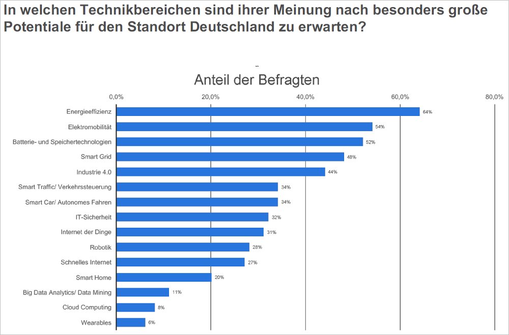 In welchen Bereichen liegen für deutsche Unternehmen die höchsten Potenziale? Der Verband der Elektrotechnik, Elektronik und Informationstechnik (VDE) hat seine Mitglieder danach befragt. Die haben klarerweise einen sehr industriell getönten Blick auf diese Frage. Das, was für die herkömmliche industrielle Produktion am bedeutsamsten ist, steht ganz weit oben: Energie-Effizienz, Smart Grid (intelligente Stromnetze) und Technologien zur Stromspeicherung. Aber auch hier folgt mit dichtem Abstand die Industrie 4.0.
