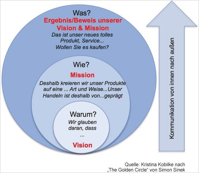Ein sehr anschauliches und äußerst hilfreiches Konzept, Ihrer Vision und Ihrer Mission auf die Spur zu kommen, liefert der britische Bestsellerautor und Unternehmensberater Simon Sinek. Er ist der Überzeugung, dass die erfolgreichsten Unternehmen der Welt ein bestimmtes und exakt gleiches Muster in ihrem Denken, Handeln und ihrer internen und externen Kommunikation eint.