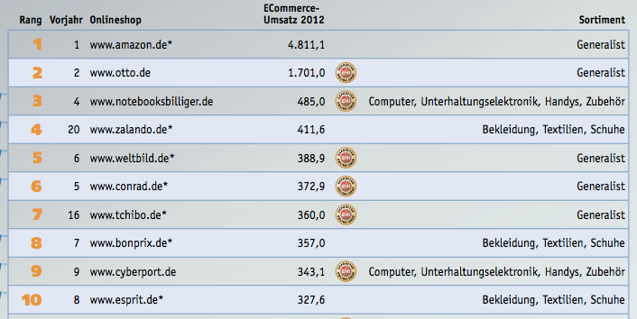 - weltbild.de auf Platz 5 mit einem geschätzten Umsatz von 388,9 Mio Euro,