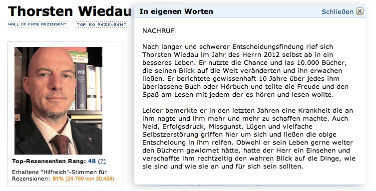 Herr Wiedau hätte die 10 Jahre Energie lieber in einen eigenen Blog stecken sollen – da hätte er mittlerweile mit Affilate-Programmen längst ein kleines Auskommen gefunden. Wer hält eigentlich die Rechte an den Rezensionen? Amazon?