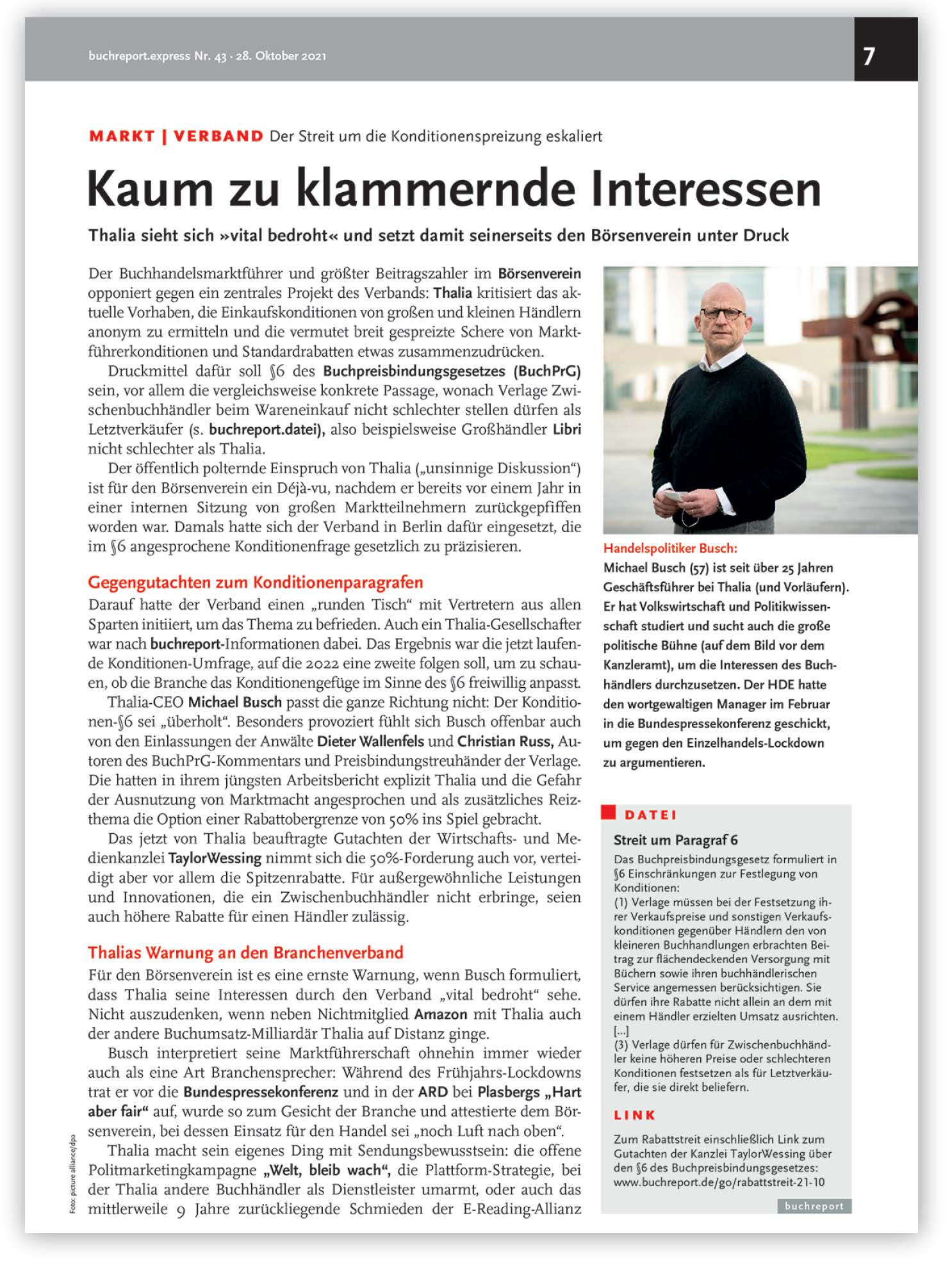 - Der Buchhandelsmarktführer und größte Börsenverein-Beitragszahler Thalia poltert mitten in der vorsichtigen Annäherung gegen den Verband: Eine Diskussion über Rabatte zu führen, sei „unsinnig“. Mit einem eigenen Rechtsgutachten versucht Thalia zudem, seine Spitzenrabatte zu verteidigen.