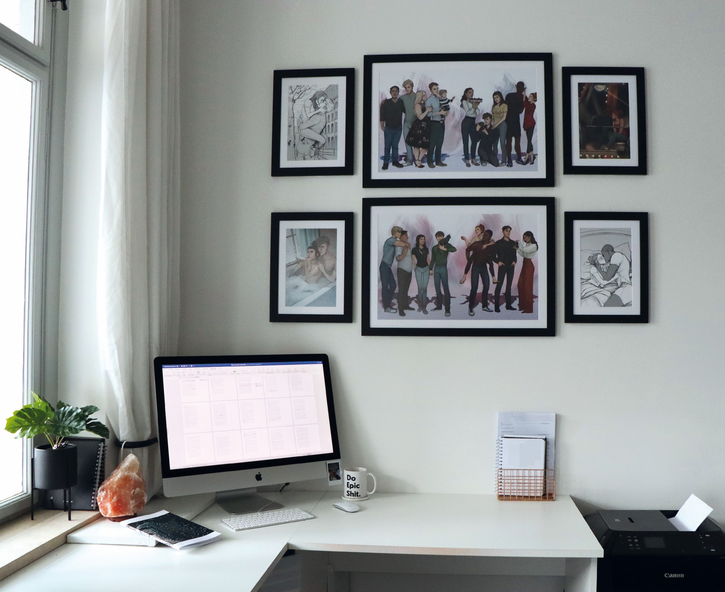 An den Wänden hängen Illustrationen aus meinen Büchern, und ich habe ein kleines Whiteboard mit Fanarts, die mir Leser geschenkt haben. Das Herzstück meines Arbeitszimmers ist ein großer Schreibtisch, auf dem mein iMac steht, mit genug Platz für all meine losen Zettel. Denn obwohl ich Dutzende von Notizbüchern besitze, notiere ich meine Ideen am liebsten auf Kopierpapier, das früher oder später dem Aktenvernichter zum Opfer fällt.
