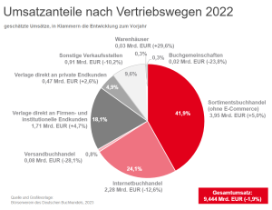 Veränderte Vertriebsstruktur. Der Sortimentsbuchhandel als größter Vertriebskanal hatte erstmals 2011 weniger als die Hälfte des Branchenumsatzes erzielt, vor allem durch den dynamisch wachsenden Online-Buchhandel. Im Zuge der Corona-Einschränkungen hatte der stationäre Buchhandel 2021 sogar 7 Prozentpunkte beim Marktanteil verloren und das Kuchenstück war auf 39%