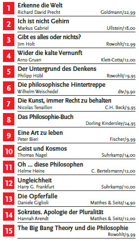 Die Themenbestsellerliste Philosophie ist in männlicher Hand. Das Spektrum reicht von Erkenntnistheorie bis Populärkultur. Die drei Spitzenreiter haben Sachbuch-Bestseller vorgelegt.