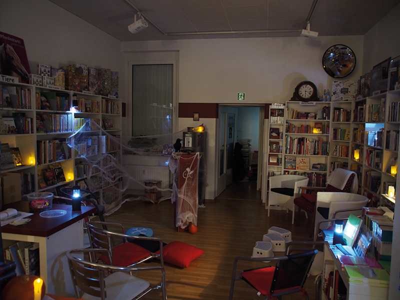 Mausbuch: Lesestimmung erzeugen mit einfachen Mitteln: Die „Taschenlampenlesung“ ist ein Klassiker im Programm der 73-qm-Buchhandlung Mausbuch in Bremerhaven. Viermal im Jahr liest Buchhändlerin Nicole Steffens rund 20 Kindern und Jugendlichen bei LED-Kerzenbeleuchtung vor, im Oktober auch bei passender Halloween-Deko. (Foto: Mausbuch)