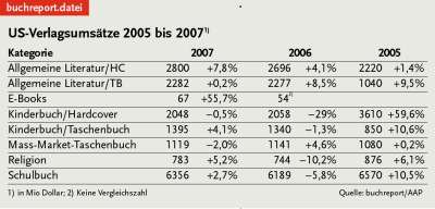 Lange Zeit hatte es für den US-Buchhandel 2007 gar nicht gut ausgesehen. Nach den ersten sechs Monaten lag der Umsatz um alarmierende 6% hinter der ersten Jahreshälfte 2006 zurück. Erst der Juli brachte die Trendwende, u.a. mit 13,1 Mio verkauften Exemplaren von „Harry Potter and the Deathly Hallows“.