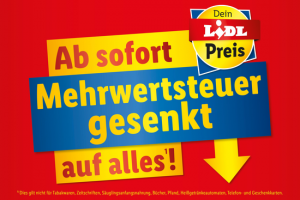 Mehrwertsteuersenkung als Marketingaktion: der Lebensmittel-Discounter Lidl hat bereits seit dem 22. Juni die Preise gesenkt. Die Preissenkungen erfolgen direkt an den Artikeln am Regal – mit auffällig rotem Preisschild. (Foto: obs/Lidl)