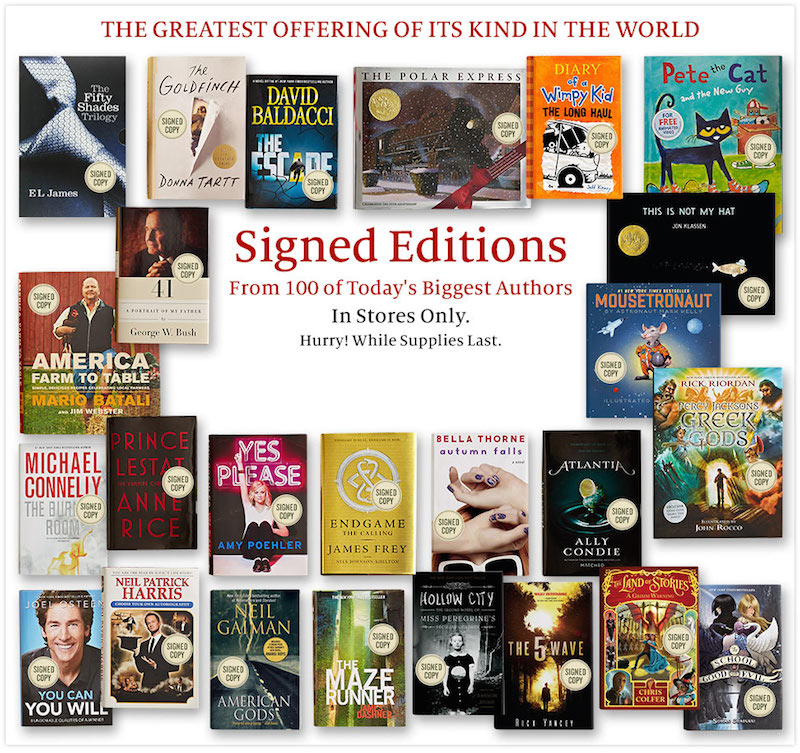 - Sich im Wettbewerb mit Amazon einen kleinen Wettbewerbsvorteil erkämpfen – die Suche nach „autographed book“ auf amazon.com ergibt aktuell nur rund 7000 Bücher. Die von den signierten Büchern in die Filialen gelockten Kunden sollen, so die Hoffnung, weitere Bücher kaufen.